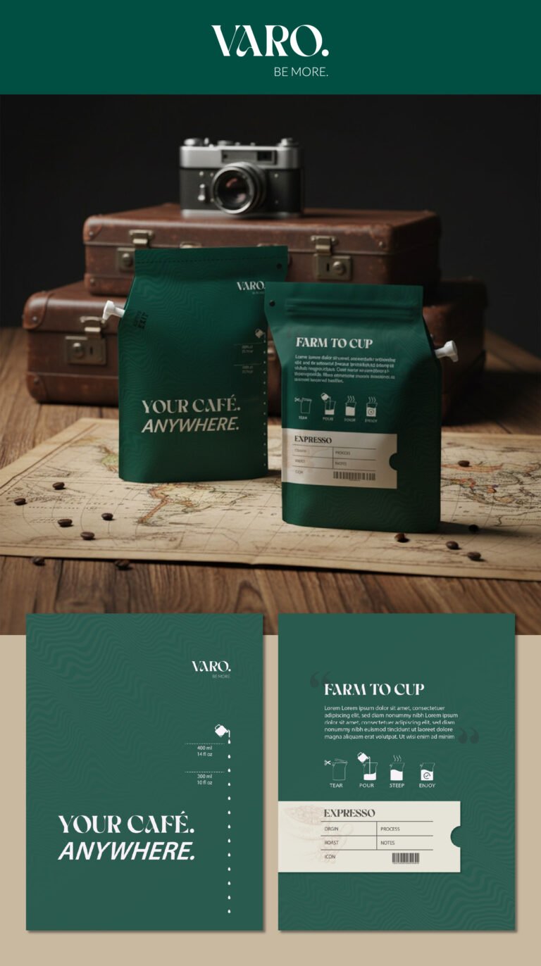 This design moves your brand away from the cluttered, “crafty” look of standard coffee bags and into the lifestyle category of high-end adventure gear. The inclusion of the “Notes” and “Process” fields on the label invites the consumer into the technical side of the craft, treating them like a connoisseur rather than just a casual drinker. By framing the product against a map of the world, we are positioning VARO as the ultimate travel companion—a literal “Café Anywhere.” This isn’t just a purchase; it’s an invitation to the consumer to document their own journey, one cup at a time.