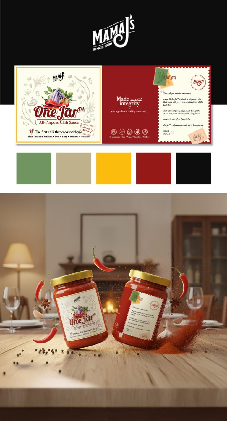 When we sat down to define the visual language for Mama J’s “One Jar,” the objective was to move beyond the typical “hot sauce” category and position this as a premium culinary staple. We wanted to capture the essence of a family heritage recipe while ensuring it looks modern and sophisticated enough for a high-end pantry. By utilizing a clean, cream-textured label backdrop, we’ve allowed the vibrant, rich red of the chili sauce to pop, while the hand-illustrated garlic and chili botanical sketches lend an air of artisanal authenticity and transparency about the ingredients inside.